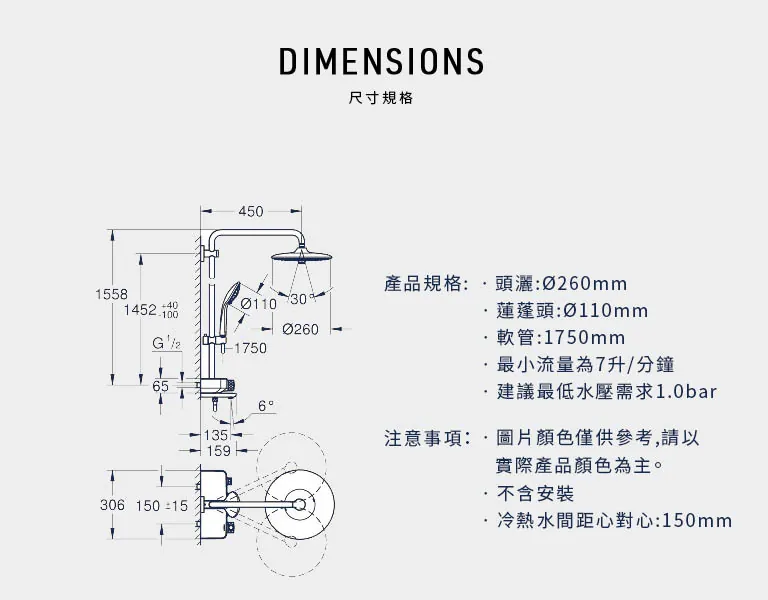 ※安裝前請測量冷熱水管之中心距離需再150±15mm之間,定溫龍頭才可貼牆安裝。